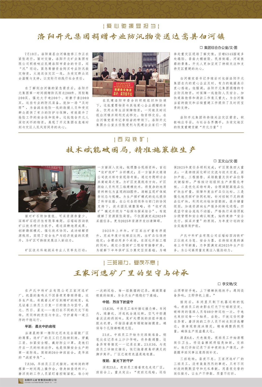 洛陽開元礦業(yè)集團(tuán)有限公司簡介洛陽開元礦業(yè)集團(tuán)有限公司,始成立于2006年,位于洛陽市開元大道269號。集團(tuán)旗下共有十余家全資子公司,業(yè)務(wù)涉及有色金屬礦山開發(fā)、礦產(chǎn)品購銷與進(jìn)出口貿(mào)易、房地產(chǎn)開發(fā)、文化藝術(shù)、企業(yè)管理與咨詢、資本投資等多個領(lǐng)域。2024年,集團(tuán)公司銷售總額達(dá)7.8億元。民建河南省委委員、民建河南省委企業(yè)委副主任、民建洛陽市委委員、企業(yè)委主任、洛陽民建企業(yè)家協(xié)會會長許明月是公司創(chuàng)始人,現(xiàn)任洛陽開元礦業(yè)集團(tuán)有限公司董事長。在礦業(yè)領(lǐng)域,洛陽開元礦業(yè)集團(tuán)擁有多家實力雄厚的子公司:貴州開元礦業(yè)有限公司探、采礦權(quán)面積共11.33平方公里;興??h銅鑫礦業(yè)有限公司探礦權(quán)面積8.76平方公里,礦山資源潛力巨大;2021年,開元集團(tuán)與盧氏中科礦業(yè)有限公司開展戰(zhàn)略合作。盧氏中科礦業(yè)有限公司專注于有色金屬的浮選、加工和銷售,擁有強大的技術(shù)支撐平臺,是集探、采、選、冶、研為一體的中大型綜合礦業(yè)企業(yè)。目前,盧氏中科王家河1000噸選礦廠已成功投產(chǎn),雙河金礦、柳關(guān)欒盧鉛鋅礦相繼順利開工,樓房銀礦與圪老灣鉛鋅礦的深部探礦重大突破,標(biāo)志著礦山版圖取得重大進(jìn)展,為開元集團(tuán)后續(xù)發(fā)展奠定了堅實基礎(chǔ)。在文化傳媒領(lǐng)域,洛陽市明月美術(shù)館通過豐富多樣的藝術(shù)展覽、學(xué)術(shù)研討和公共教育活動,努力打造一個集展覽、交流、教育、研究為一體的綜合性藝術(shù)平臺。此外,在金融投資領(lǐng)域,開元集團(tuán)旗下的北京明峰資本管理有限公司專注于投資具有高增長潛力的優(yōu)秀企業(yè),特別是高科技、新能源、環(huán)保等新興產(chǎn)業(yè),為客戶提供個性化的資產(chǎn)配置服務(wù)。在做好企業(yè)經(jīng)營的同時,開元集團(tuán)始終不忘企業(yè)的社會責(zé)任和家國情懷,以突出的愛心公益事跡,開展了一系列公益慈善活動:“民建林”公益事業(yè)通過“思源基金”“幫幫公益”線上公益平臺,與眾多愛心人士籌措資金20余萬元;資助541名貧困大學(xué)生共計270余萬元,推進(jìn)“數(shù)字助力——河南AI人才培養(yǎng)”;捐款10萬元,馳援京津冀、黑龍江洪水地質(zhì)災(zāi)害……公司于2017年底被洛陽市慈善總會評為“洛陽慈善風(fēng)云榜——十大愛心集體”。洛陽開元礦業(yè)集團(tuán)有限公司秉承持續(xù)發(fā)展理念,憑借多年來良好的企業(yè)信譽與經(jīng)營業(yè)績,與全國多家企業(yè)建立了良好合作關(guān)系,受到社會各界的一致好評,多次榮獲“納稅標(biāo)兵”“先進(jìn)企業(yè)”“招商引資模范企業(yè)”等榮譽稱號?;赝麃頃r路,開元人勠力同心,以“闖”的精神和“創(chuàng)”的勁頭,一路披荊斬棘,踏過千山萬水;展望新未來,開元人凝心聚力,不執(zhí)于“舊”,無畏于“新”,秉承“勇于跨越,追求卓越”的企業(yè)精神,乘著國家高質(zhì)量發(fā)展新征程的東風(fēng),跨過高山,越過大海,向著集團(tuán)多元化、國際化的目標(biāo),逐夢遠(yuǎn)航,跨越前行!